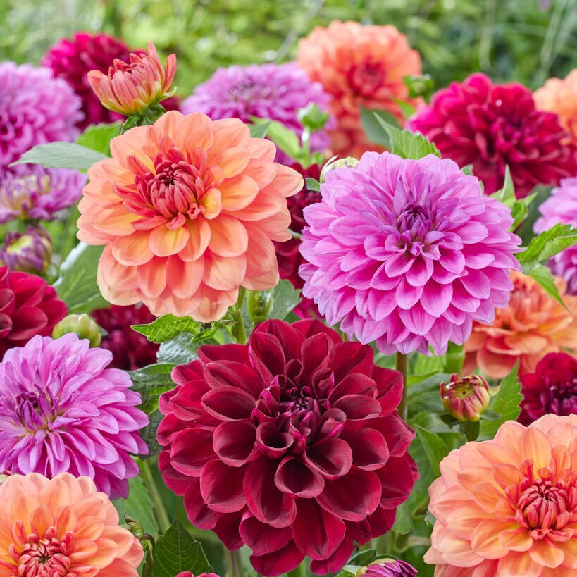 Kırmızı, pembe, sarı, turuncu ve beyaz gibi çeşitli renklerde göz alıcı bir dahlia karışımı üretir; canlı bir bahçe görüntüsü yaratmak için mükemmeldir.