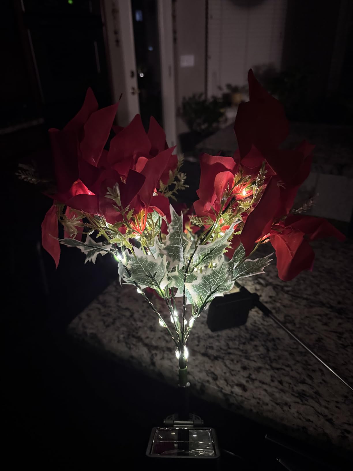 I wasn’t sure how bright they would be, but wow — they exceeded my expectations. The petals look like real Poinsettias, and the warm glow makes my front garden feel so cozy for Christmas. I love that they recharge on their own, so I don’t have to deal with wires or timers.