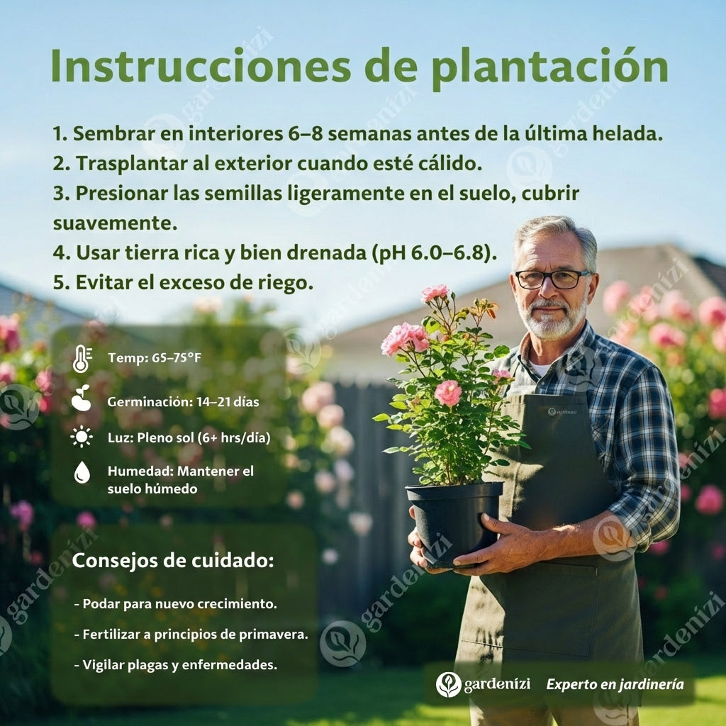 Todas las semillas de Gardenizi son sometidas a pruebas de calidad para garantizar una germinación fuerte y un crecimiento saludable; ofrecemos orientación personalizada, consejos prácticos y respuestas a tus preguntas desde la siembra hasta que tu jardín esté en plena floración, para que siempre tengas apoyo en cada paso.